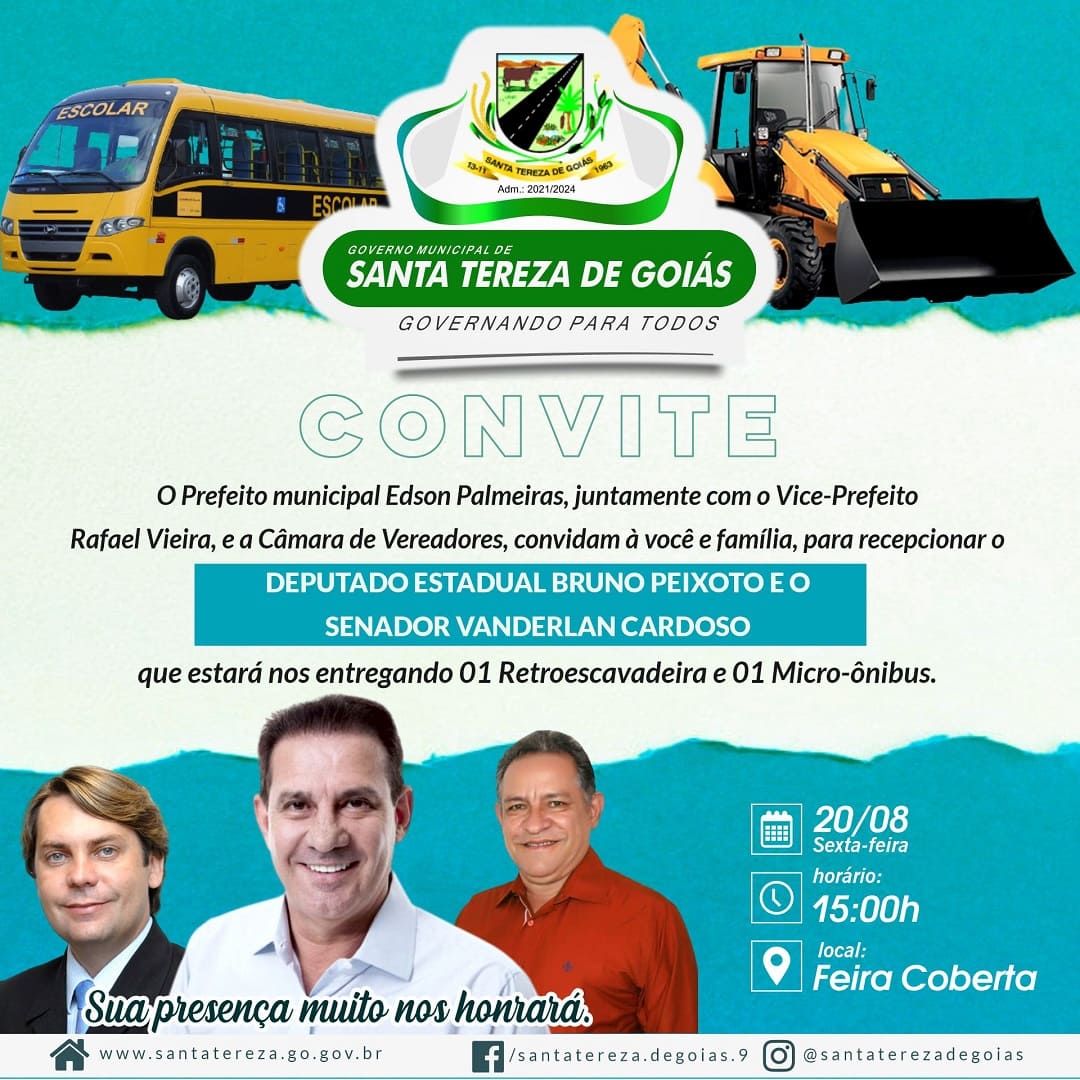 O Prefeito municipal Edson Palmeiras, juntamente com o Vice-Prefeito Rafael Vieira, e a Câmara de Vereadores, convidam à você e família, para no próximo dia 20 de agosto as 15:00 horas, na Feira Coberta, recepcionar o Deputado Bruno Peixoto e o Senador Vanderlan Cardoso que estará nos entregando 01 Retro-Escavadeira e 01 Micro-ônibus. Sua presença muito nos honrará.
